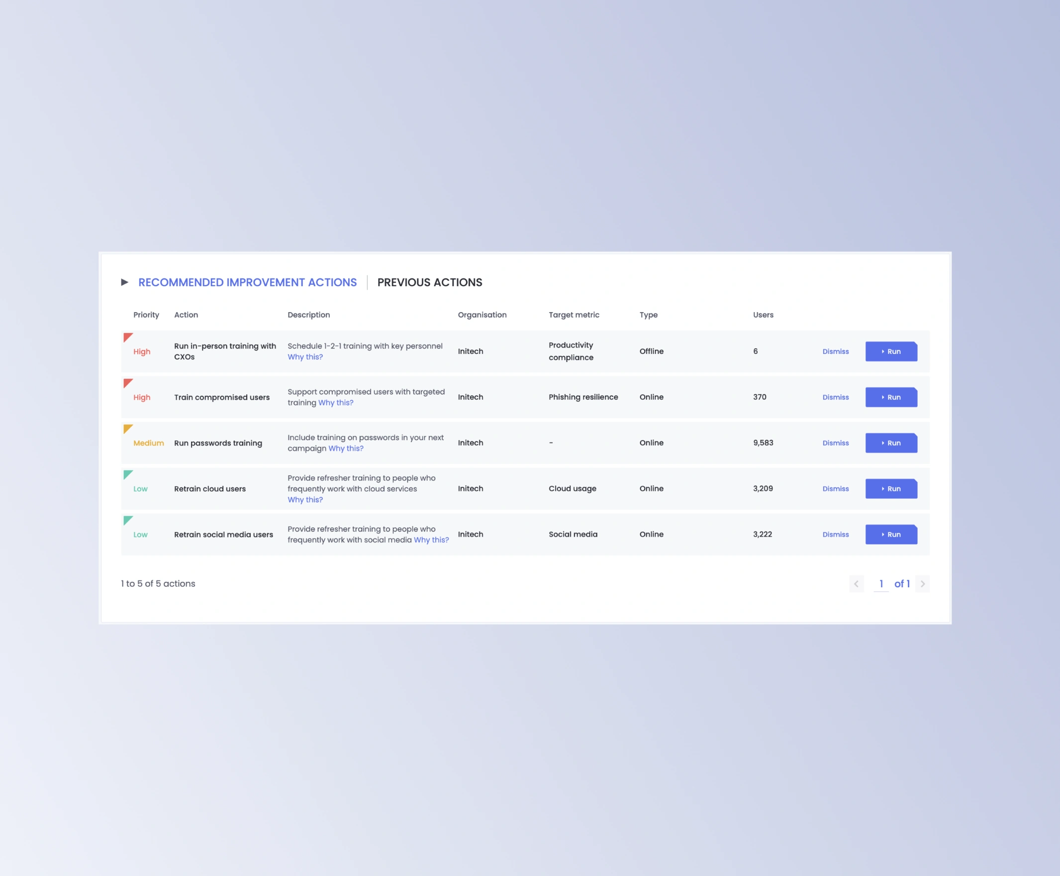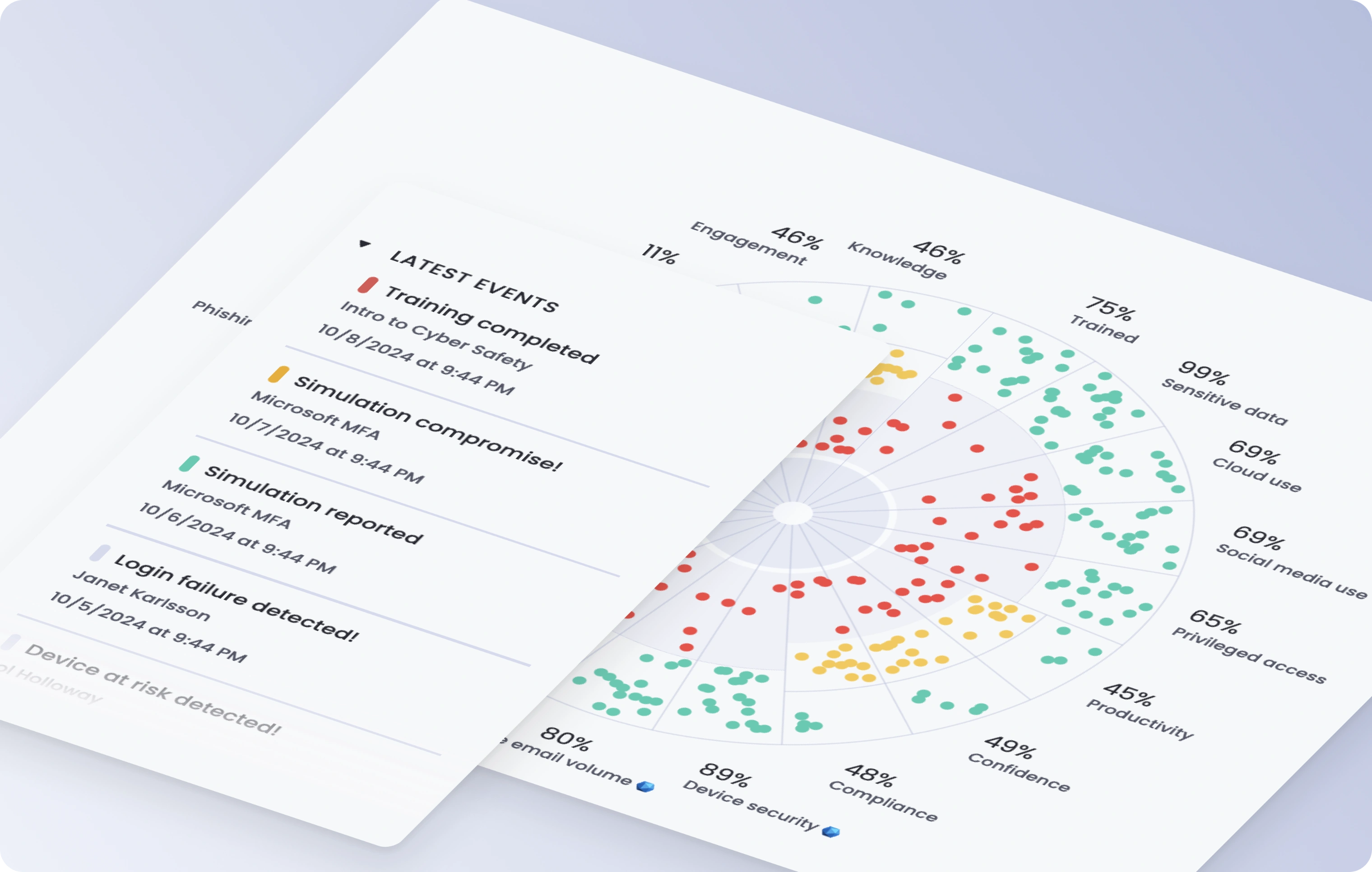 Gain insight to each user’s role, performance, and engagement in adaptive security awareness training and phishing simulations. Address behaviors which require most attention.