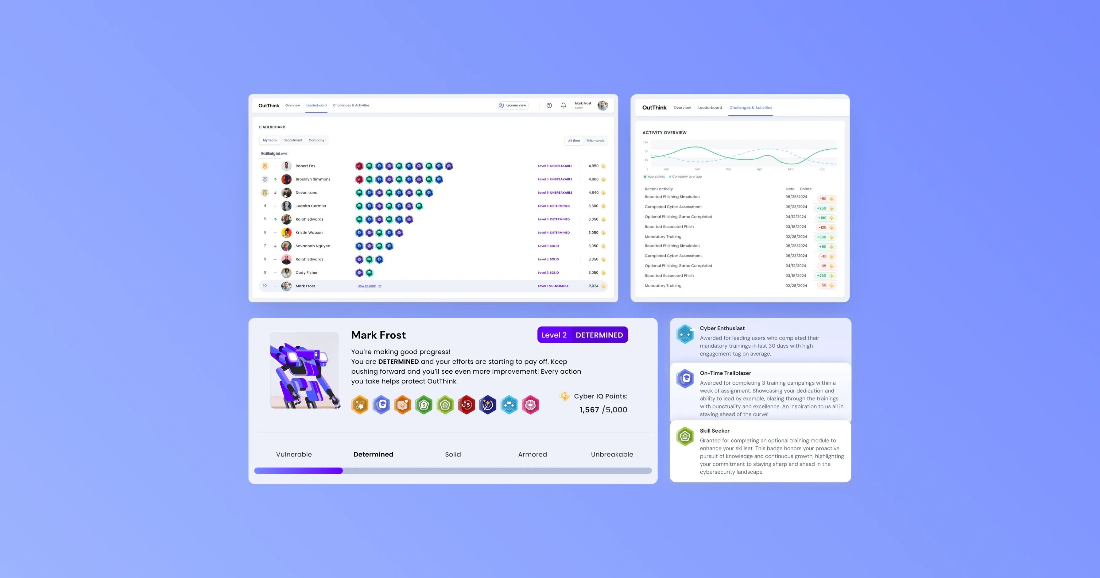 OutThink's CyberIQ Portal displaying a leaderboard, user progress with badges, activity overview, and positive reinforcement.